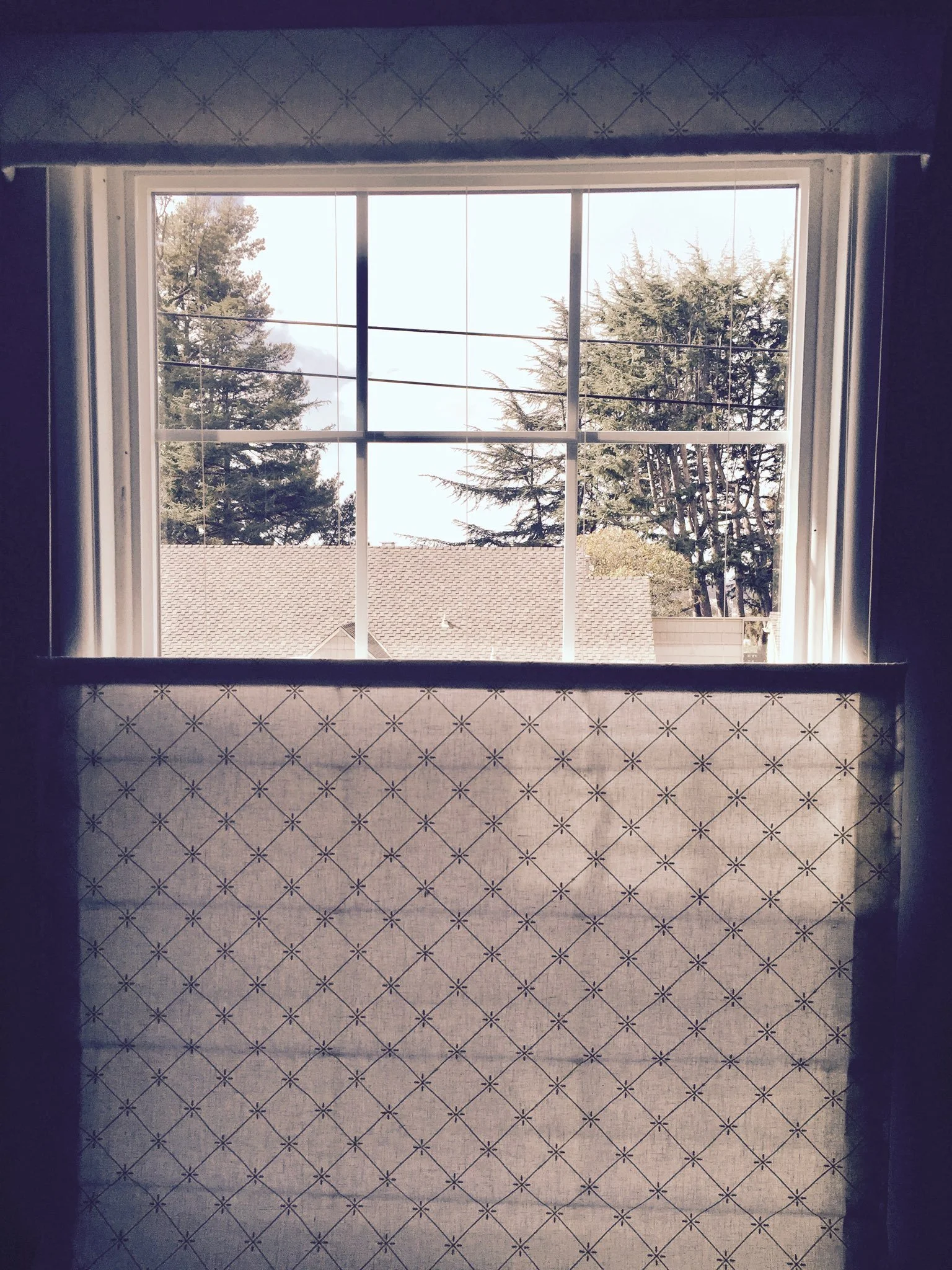 Corner Window Solution! Butt/Pass Light Filtering Roller Shades under Fabric Cornices