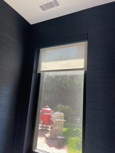 Inside Mounted Solar Roller Shades Behind Natural Woven Waterfall Roman Shades